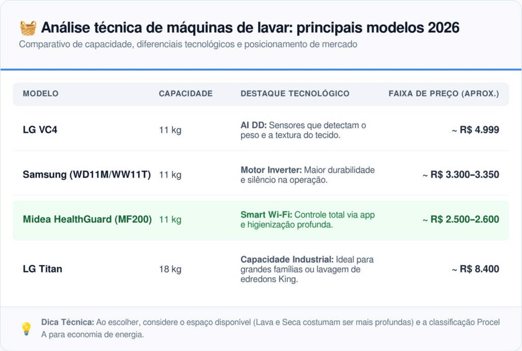 Ao analisar as melhores lava e seca, é preciso comparar a capacidade de secagem e as funções extras de cada fabricante. Modelos como o da Midea ganham espaço pelo custo-benefício, enquanto a LG foca em automação.