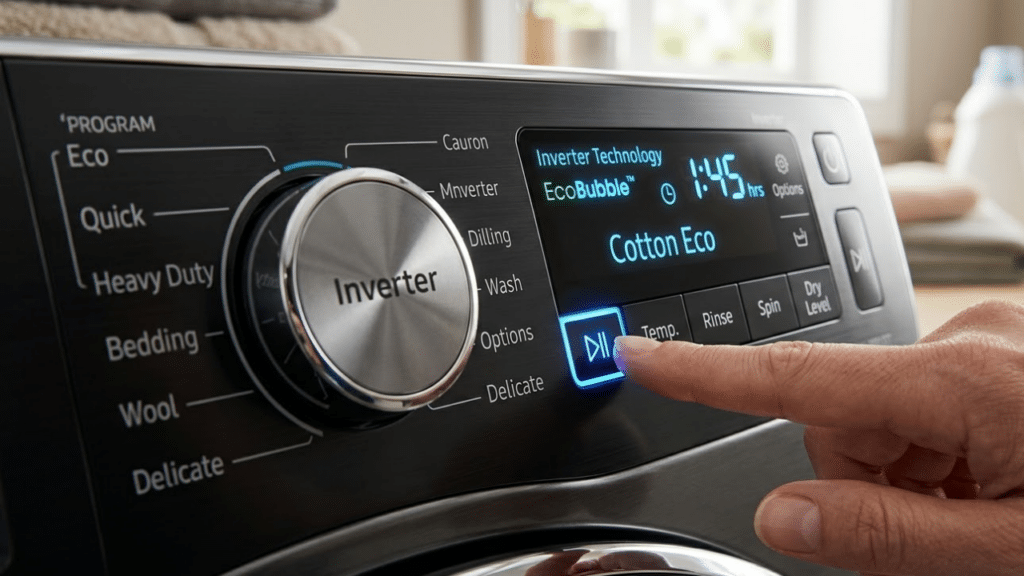 O motor Inverter é o coração das máquinas modernas e garante que o consumo de energia seja reduzido drasticamente. Em 2026, quase todos os modelos de ponta possuem o selo Procel A, consumindo entre 0,25 e 0,30 kWh por ciclo.