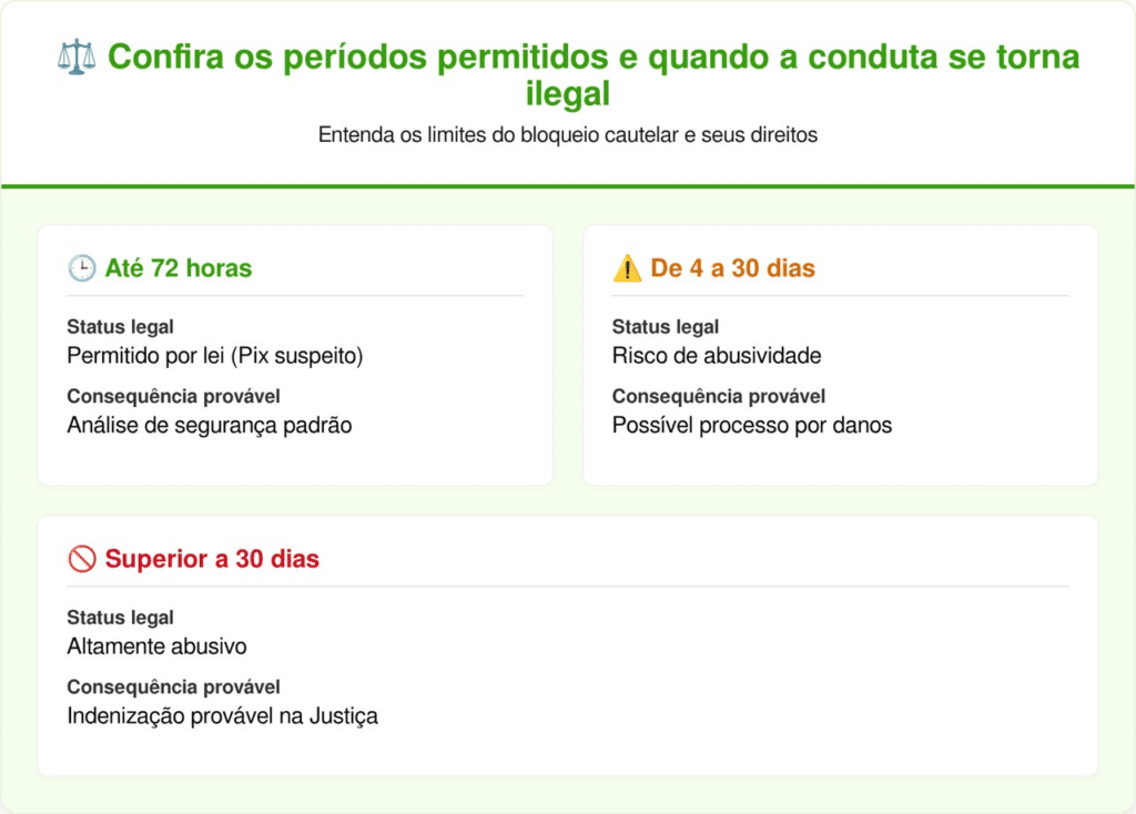 O Banco Central do Brasil, por meio de resolução publicada em setembro de 2021 com vigência a partir de novembro daquele ano, estabeleceu normas para evitar abusos. O bloqueio preventivo em transações via Pix sob suspeita de fraude deve durar no máximo 72 horas para análise detalhada, com notificação obrigatória ao usuário.