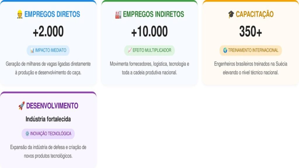 O projeto do Gripen já trouxe impactos significativos para a economia brasileira. Segundo a Força Aérea Brasileira (FAB), o programa gerou milhares de empregos e impulsionou o setor industrial. Veja os impactos do projeto: