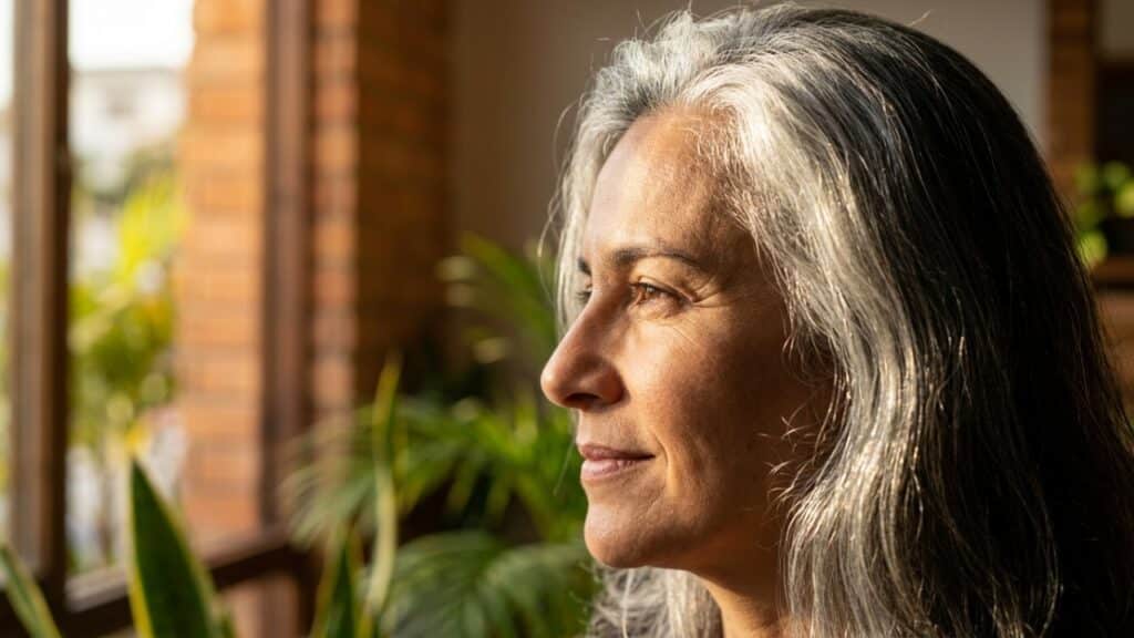 Mulher brasileira grisalha sorri sob luz dourada, revelando resiliência