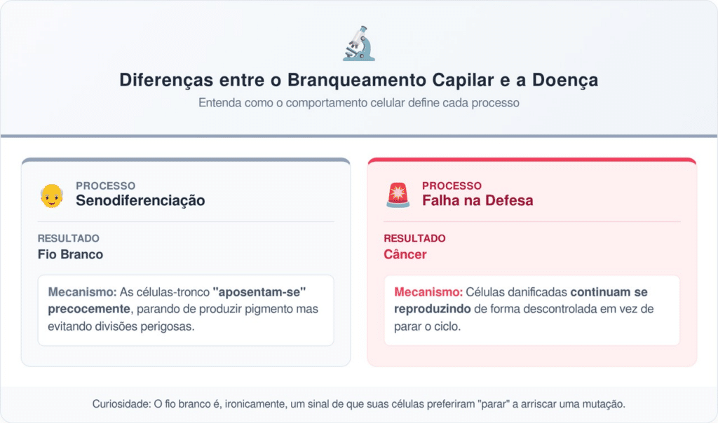 Essa interrupção funciona como uma barreira biológica que impede que células instáveis continuem ativas no folículo capilar. Ao “aposentar” essas células, os fios perdem a cor, mas o corpo reduz as chances de uma proliferação tumoral descontrolada naquela região.