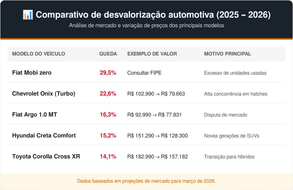 Para entender como o mercado se comportou de 2025 para março de 2026, observe os dados comparativos de desvalorização dos principais modelos: