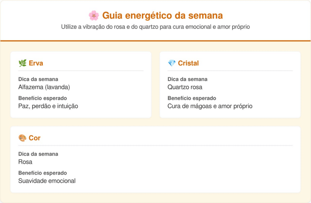 A cor da semana é o Rosa, ideal para iluminar a alma e transcender mágoas. Para potencializar essa energia, utilize o Quartzo Rosa como amuleto. Meditar segurando esta pedra sobre o coração ajuda na liberação de traumas afetivos e na conexão com o amor universal.