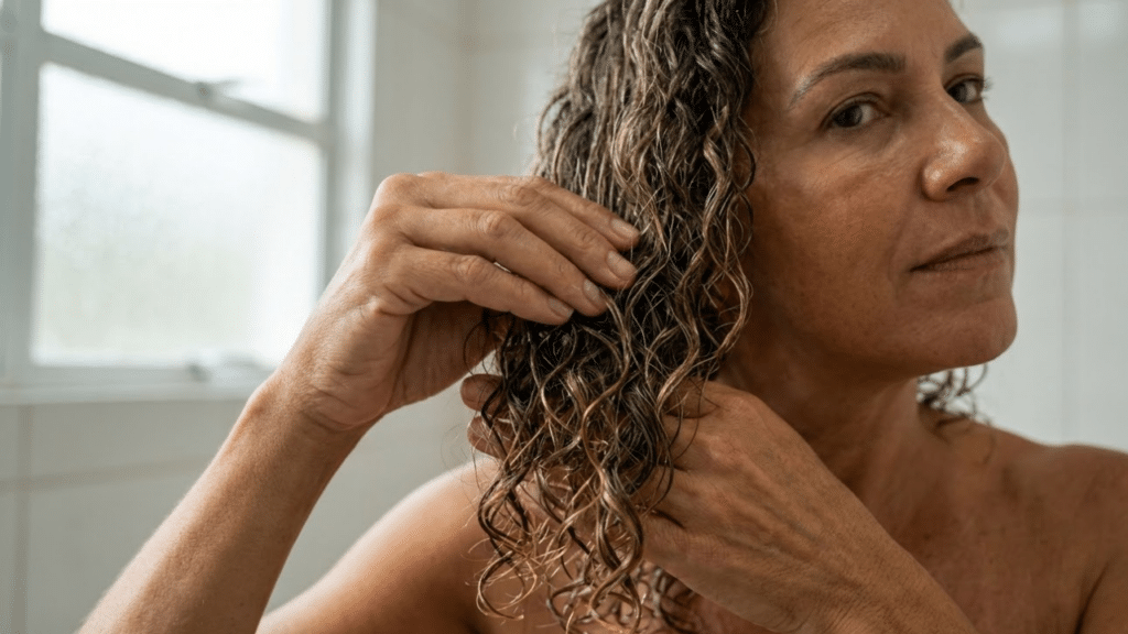 A redução do colágeno e as oscilações hormonais tornam o cabelo mais sensível e propenso ao ressecamento severo. Em fios ondulados e cacheados, isso se traduz em perda de definição e um aumento considerável do frizz, especialmente nas camadas superiores.