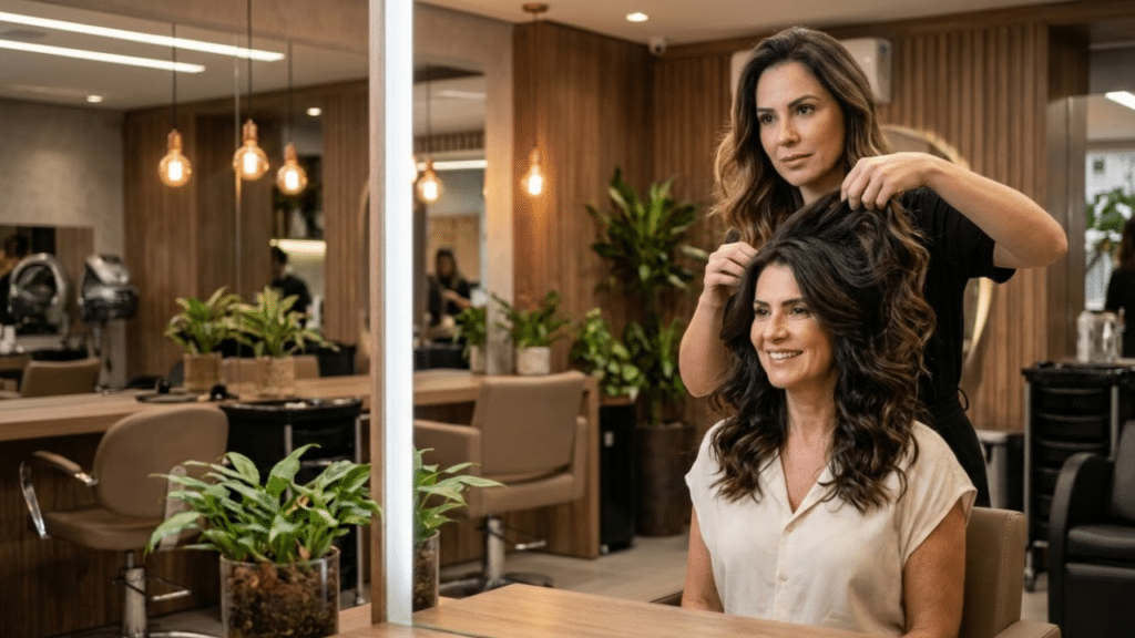 Um bom corte em camadas é fundamental para evitar o “efeito pirâmide”, onde o volume se concentra apenas nas pontas. Camadas distribuídas estrategicamente trazem leveza ao topo da cabeça e ajudam as ondas e cachos após os 45 anos a se formarem com mais facilidade.
