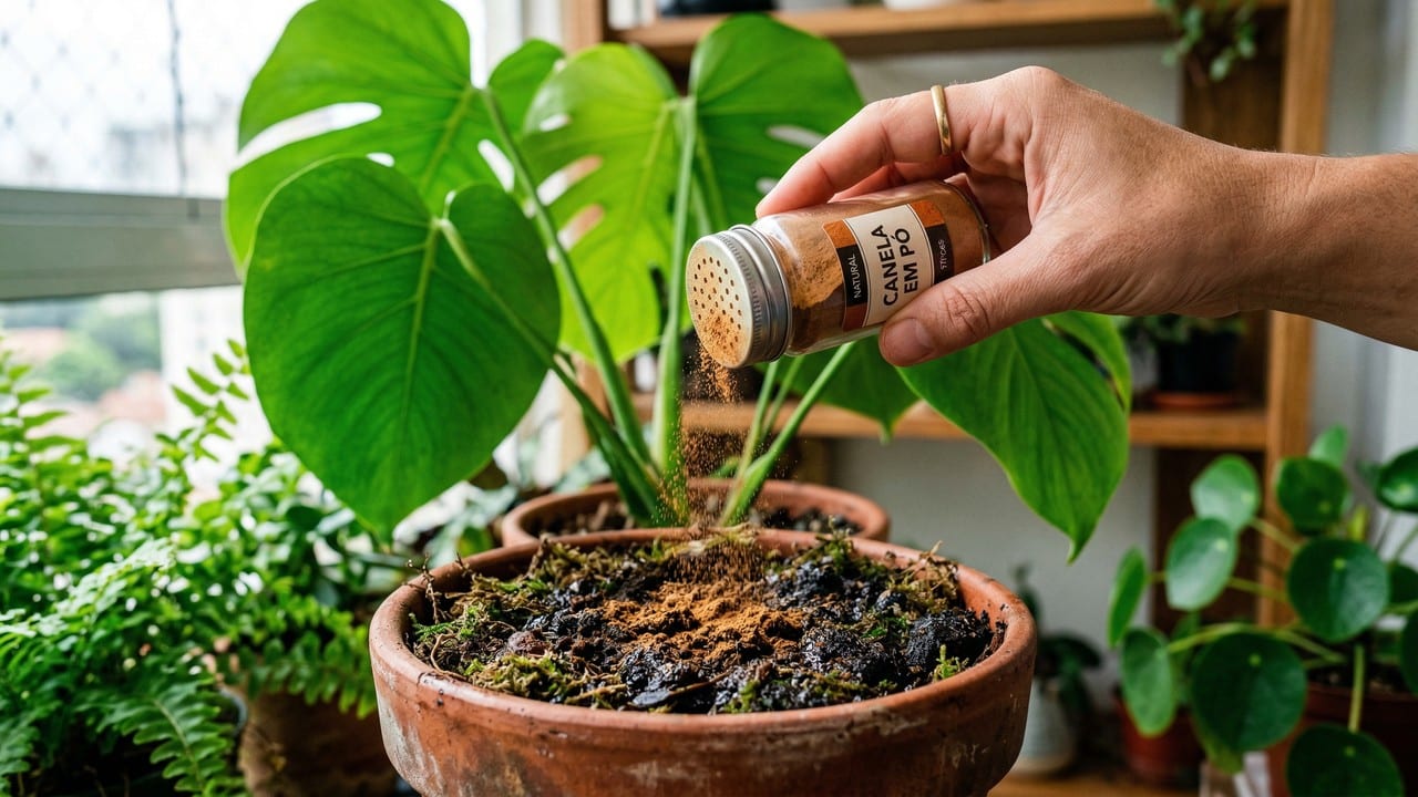 Um modo simples é polvilhar levemente a canela sobre o solo já úmido, formando uma película discreta. Em vasos de médio porte, uma colher de chá rasa costuma ser suficiente, sempre mantendo as regas equilibradas e a boa drenagem.