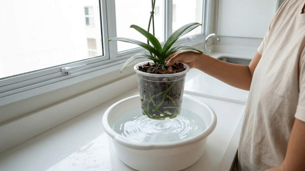 A rega deve ser feita apenas quando o substrato estiver quase seco. O método mais eficaz é a imersão rápida: coloque o vaso em um balde com água por alguns minutos e deixe escorrer totalmente. Nunca deixe água parada no prato ou no “miolo” da planta, pois isso causa o apodrecimento das raízes.