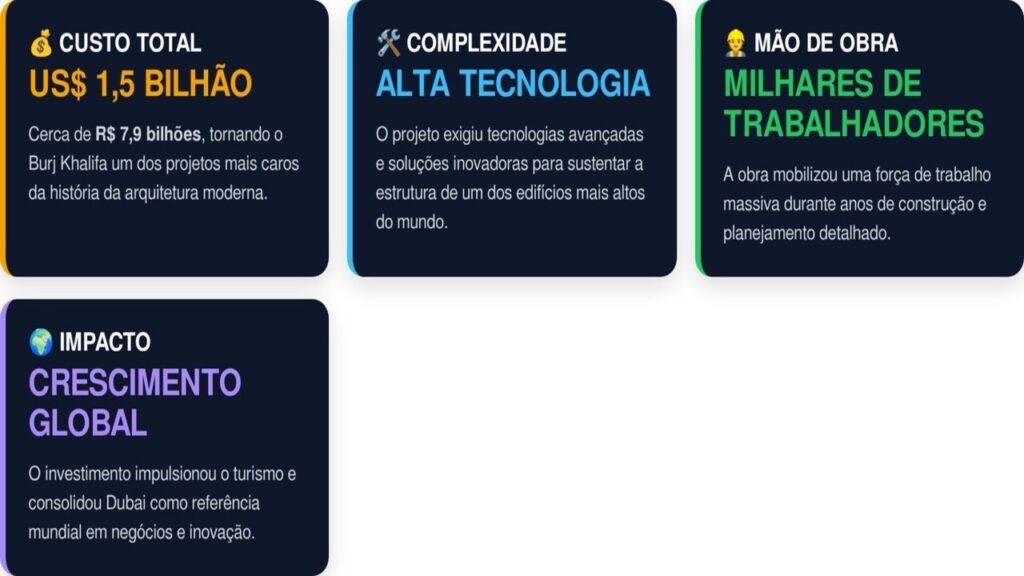 A construção do Burj Khalifa foi um dos projetos mais caros já realizados no mundo da arquitetura. O custo total foi estimado em cerca de 1,5 bilhão de dólares (cerca de R$ 7,9 bilhões). Esse valor elevado se justifica pela complexidade do projeto, pela necessidade de tecnologias avançadas e pela quantidade de materiais utilizados. Veja detalhes do prédio: