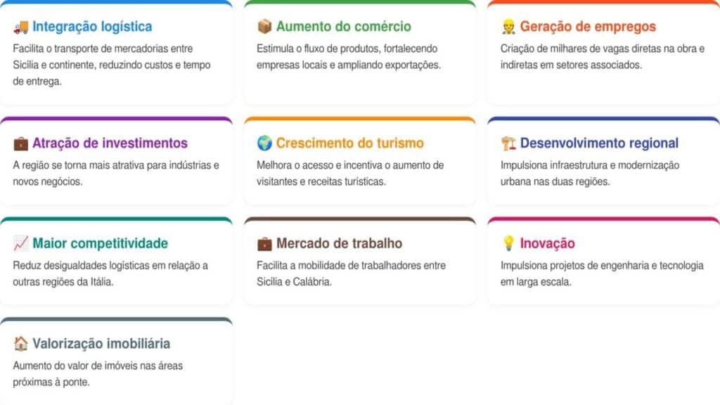 O governo afirma que a ponte será um grande motor de desenvolvimento para o sul da Itália. A expectativa é reduzir o isolamento da Sicília e integrar melhor a região ao restante do país.