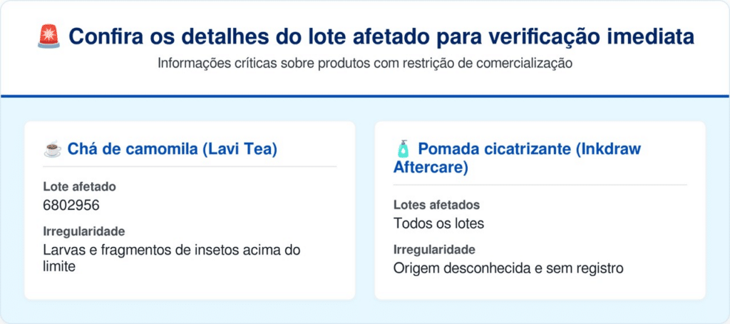 Confira os detalhes do lote afetado para verificação imediata: