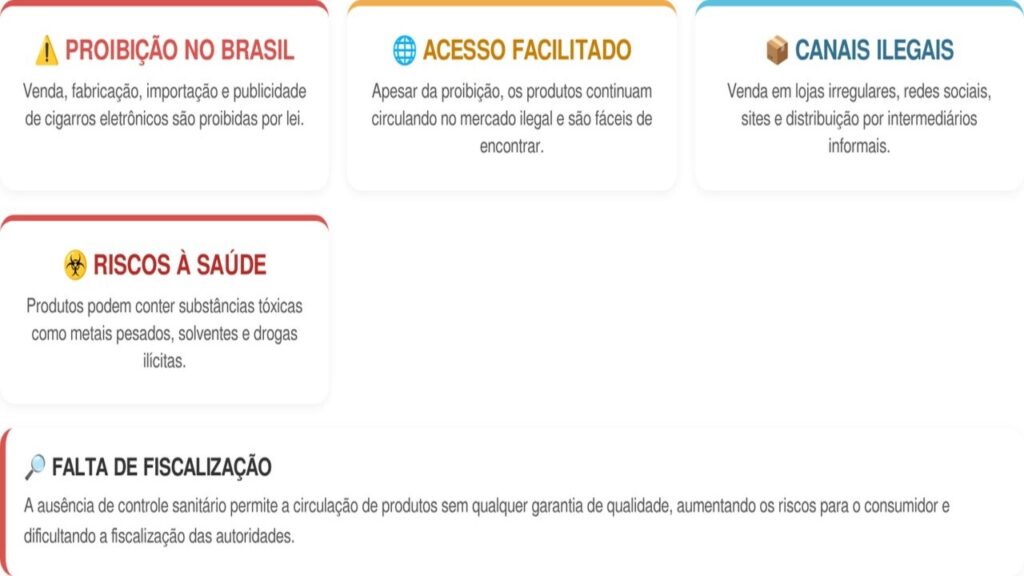 No Brasil, a venda de cigarros eletrônicos é proibida, incluindo fabricação, importação e publicidade. Mesmo assim, os produtos são facilmente encontrados no mercado ilegal. Esse acesso facilitado ocorre principalmente por canais não regulamentados. Entre os principais meios de distribuição, estão: