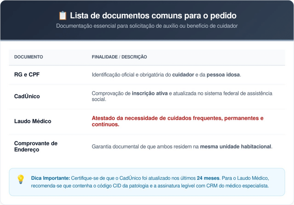 Para acessar o recurso, é necessário que o cuidador e a pessoa idosa atendam a critérios de vulnerabilidade econômica. As informações são verificadas pelas equipes municipais de assistência social por meio de entrevistas e visitas domiciliares detalhadas para comprovar a fragilidade clínico-funcional.