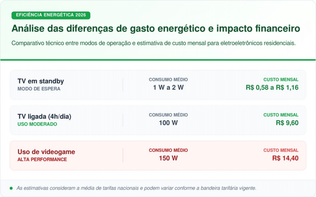 Se o modelo for antigo ou possuir recursos de inicialização rápida que consomem 2 W, esses valores dobram rapidamente. Para visualizar a diferença de impacto entre o modo de espera e o uso ativo, acompanhe o comparativo técnico de consumo médio abaixo: