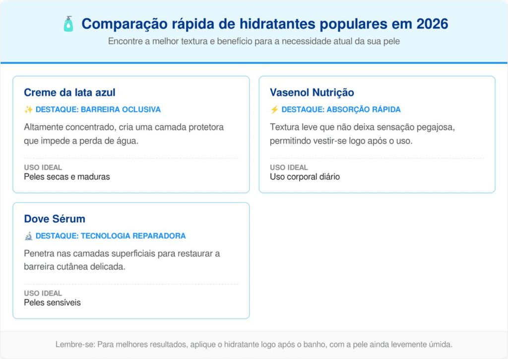 Segundo orientações da Sociedade Brasileira de Dermatologia, o uso de hidratantes densos é fundamental para tratar áreas de extremo ressecamento. O creme da lata azul é frequentemente indicado para suavizar a pele áspera de cotovelos, joelhos e calcanhares rachados.