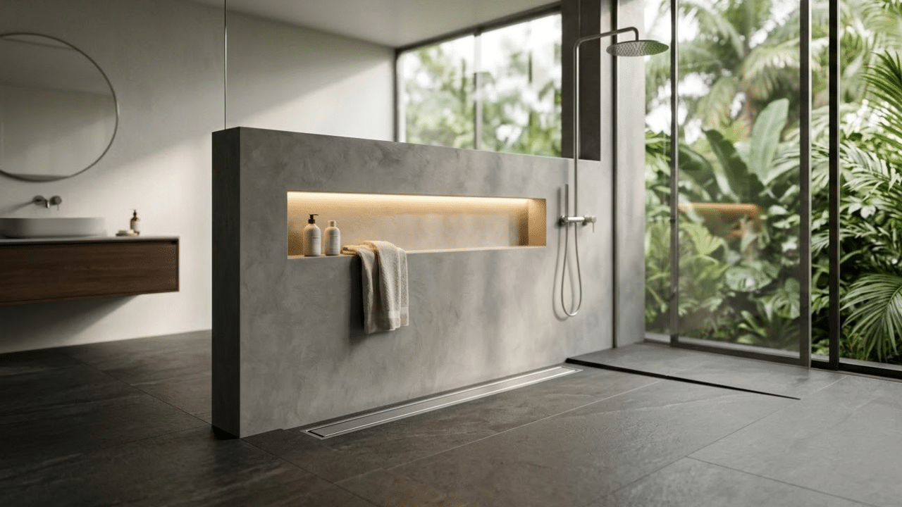 • Mureta: Erguida em alvenaria leve ou gesso hidrorrepelente, revestida com microcimento ou porcelanato.