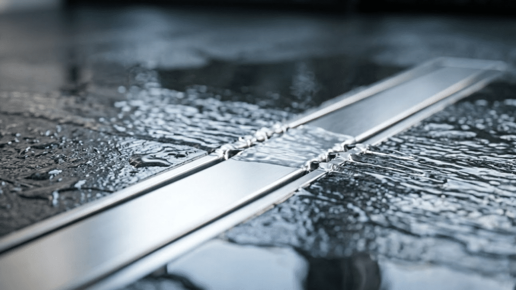 Para que o conceito walk-in funcione sem alagamentos, a engenharia do piso é fundamental. O segredo está no ralo linear, uma calha de aço inox ou carbono que pode ter de 60 cm a 120 cm de comprimento, capaz de drenar até 50 litros de água por minuto. Ele é instalado em um piso com inclinação estratégica de 1% a 2%, garantindo que a água nunca saia da área de banho.