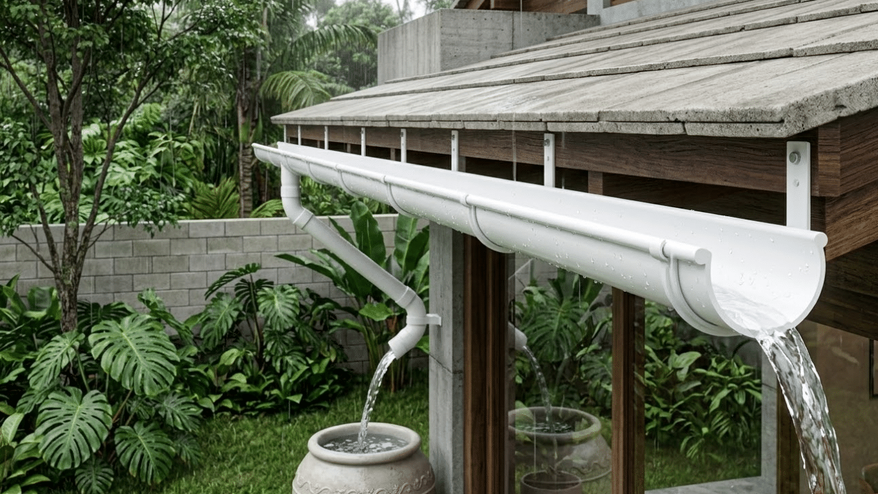 Sistema de PVC captando chuva em uma casa moderna sob luz natural