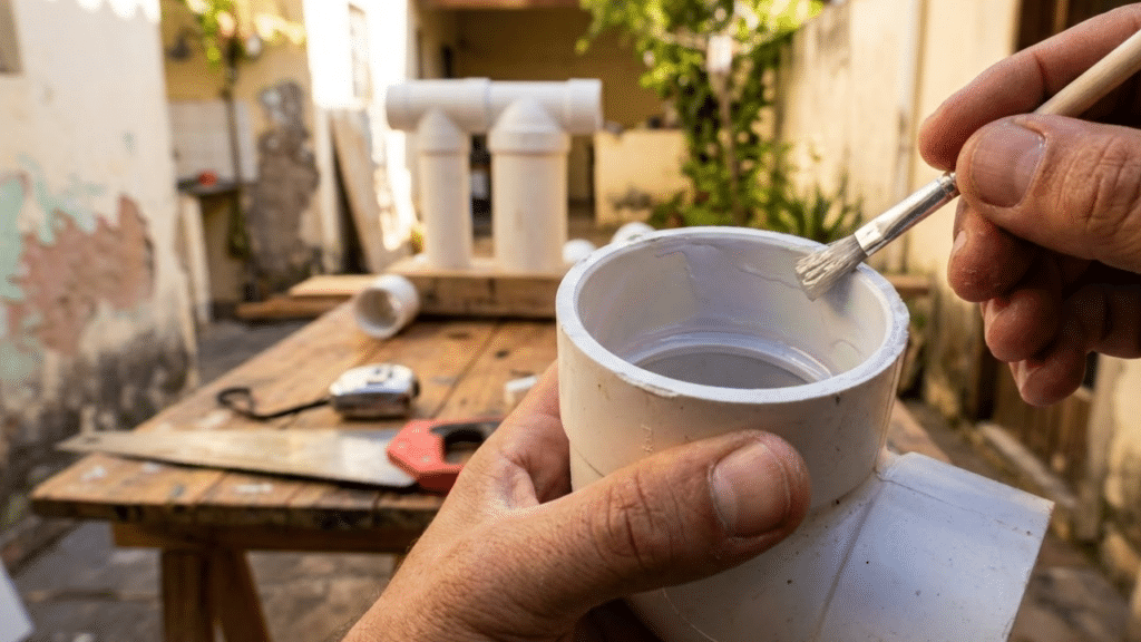 Mãos colando conexões de PVC em um projeto manual