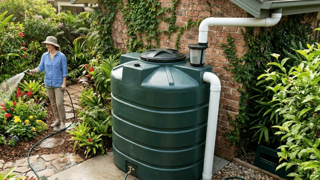 Cisterna de 500L integrada ao jardim, sendo usada para irrigação