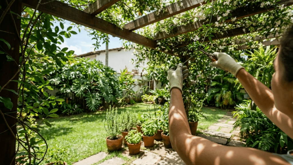 Para trepadeiras como o jasmim e a madressilva, o objetivo em março é manejar o crescimento excessivo acumulado nos meses de calor. Ao encurtar ramos muito longos, você prepara a estrutura para suportar os ventos do outono e garante que a planta concentre seus nutrientes na formação de brotos mais resistentes futuramente.