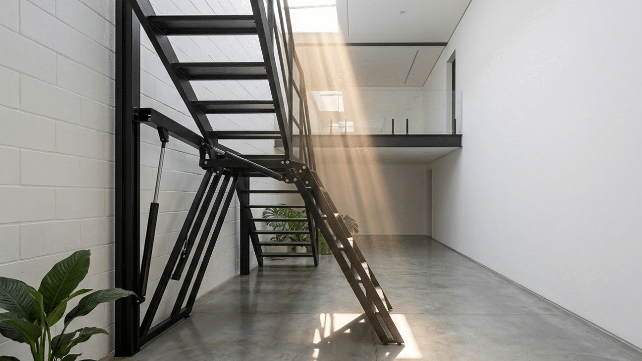 Diferente das escadas caracol ou fixas, este modelo utiliza uma estrutura de aço com dobradiças laterais que permite um giro de 90° para encostar totalmente na parede. Esse movimento libera cerca de 80% do espaço em corredores com menos de um metro de largura, transformando uma área de passagem obstruída em um ambiente livre.