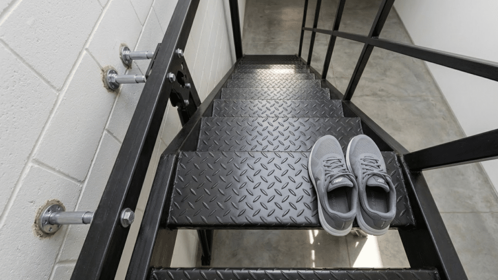 A construção técnica utiliza perfis de aço carbono 50×50 mm ou alumínio de alta resistência (6063-T5), ideal para regiões litorâneas devido à proteção anticorrosão. Os degraus são fabricados em chapa xadrez antiderrapante, garantindo que o usuário não escorregue, mesmo com calçados úmidos.