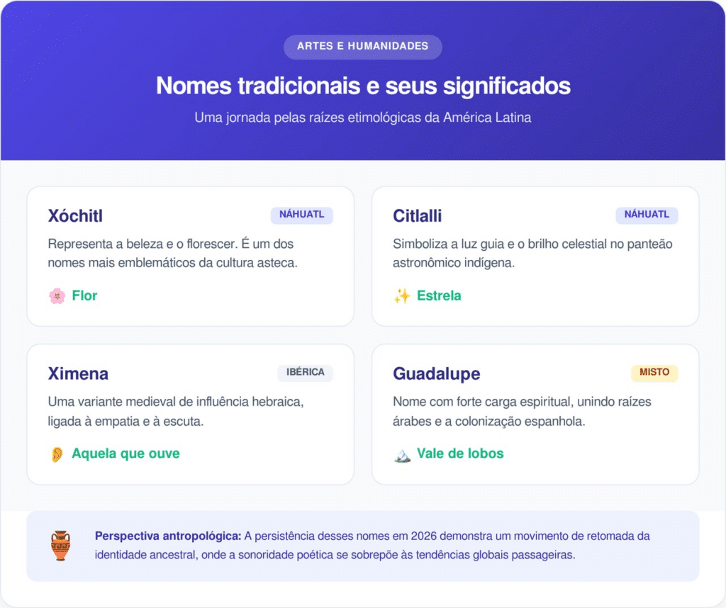 O uso de nomes de origem náhuatl, como Xóchitl, cresce devido a um movimento de valorização das raízes pré-hispânicas. Esses nomes mexicanos evocam a beleza natural e são escolhidos por pais que desejam manter viva a história dos povos astecas e zapotecas.