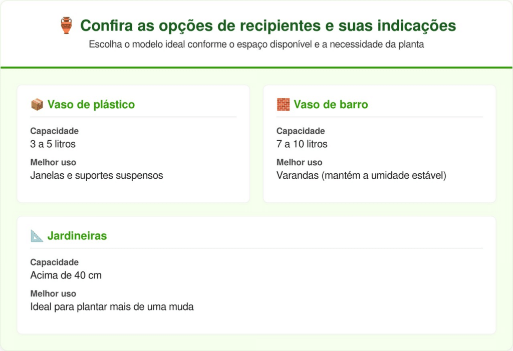 O sucesso do cultivo começa na escolha do recipiente. O tomate-cereja não exige vasos profundos, mas precisa de uma drenagem eficiente para evitar o apodrecimento das raízes. Vasos de 3 a 10 litros são suficientes para garantir uma planta saudável e vigorosa.