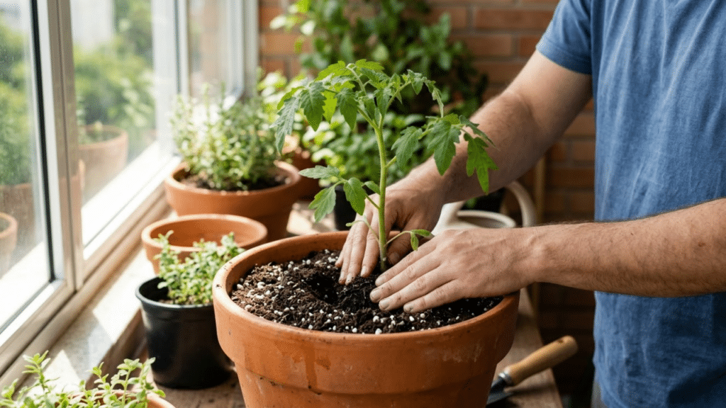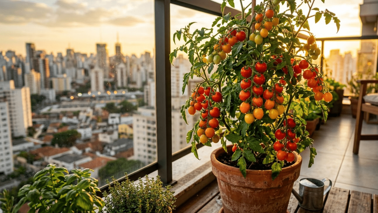 Para ser considerada a planta frutífera perfeita para apartamentos, ela precisa de luz. O tomate-cereja exige, no mínimo, 4 a 6 horas de sol direto por dia. Sem essa luminosidade, a planta cresce frágil (estiolada) e produz poucas flores, resultando em uma colheita escassa.