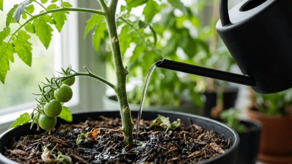 - Poda de limpeza: Retire as folhas amareladas e os “brotos ladrões” (que nascem nas axilas dos galhos) para direcionar a energia para os tomates.