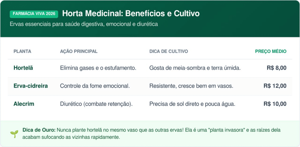 Ter uma horta em casa vai muito além do tempero. Em 2026, o cultivo de ervas medicinais em apartamentos tornou-se uma estratégia prática para quem busca o emagrecimento saudável. Algumas plantas ajudam a reduzir o inchaço e otimizar a digestão, funcionando como coadjuvantes naturais no seu dia a dia.