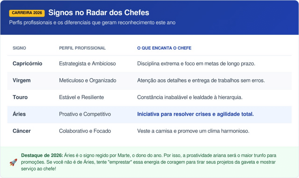 No competitivo ambiente corporativo, as características natas dos signos do zodíaco podem ser o diferencial entre o estancamento e uma promoção rápida. De acordo com a astrologia comportamental, as lideranças tendem a favorecer perfis que unem disciplina, previsibilidade e entrega de resultados consistentes.