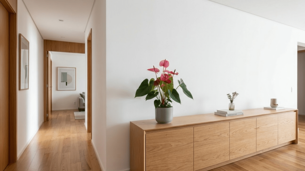 Em apartamentos pequenos, o Antúrio cumpre o papel de ponto focal, atraindo o olhar e trazendo cor sem ocupar área útil. Em fundos neutros, como paredes brancas ou móveis claros, suas flores ganham ainda mais evidência.