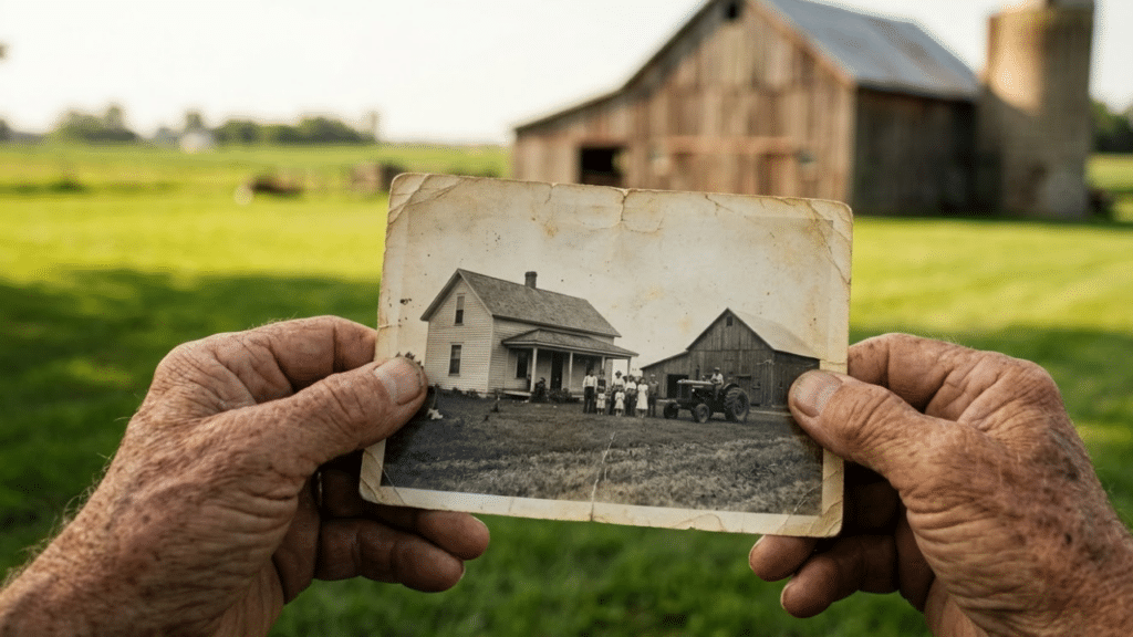 Perspectiva em primeira pessoa segurando uma foto antiga da fazenda familiar