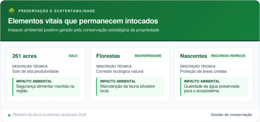 A manutenção da vegetação e do solo produtivo contribui diretamente para a recarga do lençol freático e para a resiliência climática da região. Diferente dos grandes projetos de tecnologia, que exigem resfriamento intenso e impermeabilizam o solo, a fazenda continua funcionando como um filtro natural.