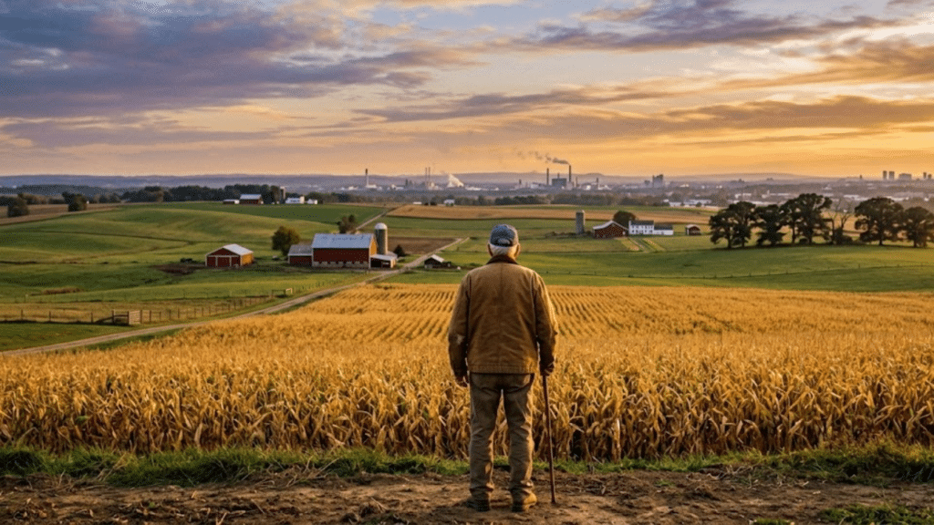 Um fazendeiro idoso observa sua vasta plantação de milho na Pensilvânia sob um céu dramático de fim de tarde