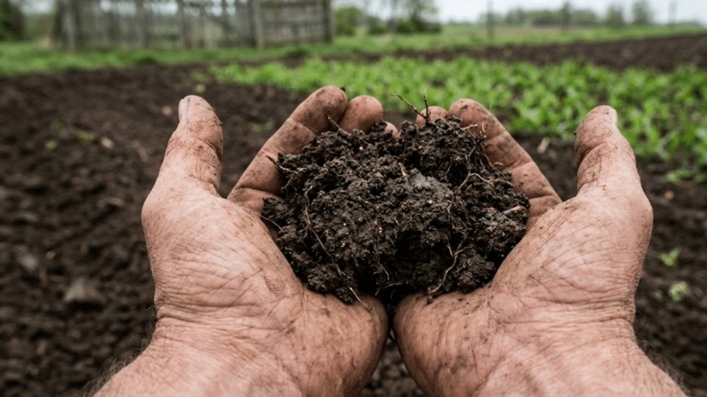 Visão em primeira pessoa de mãos calejadas segurando a terra fértil e escura da fazenda