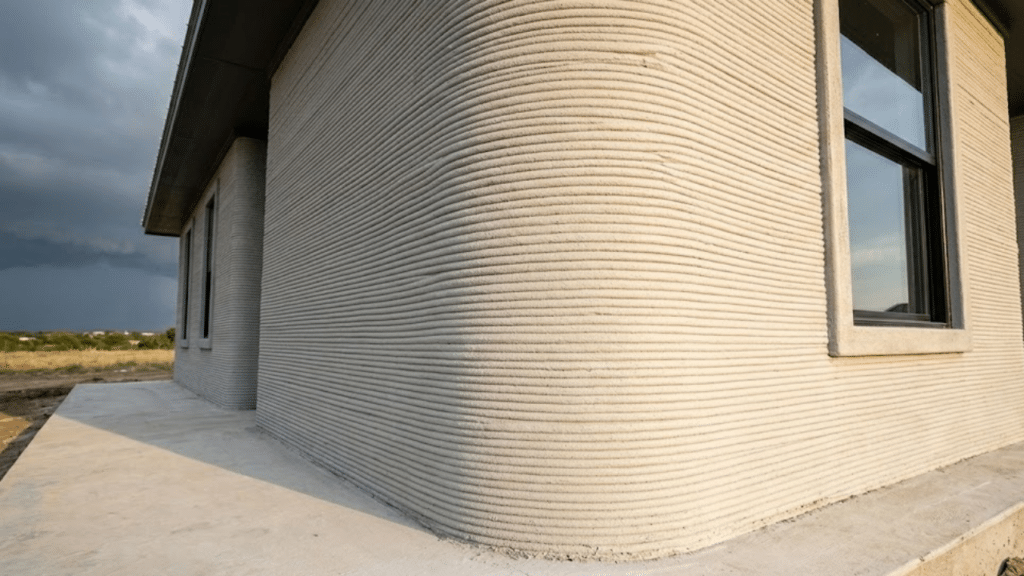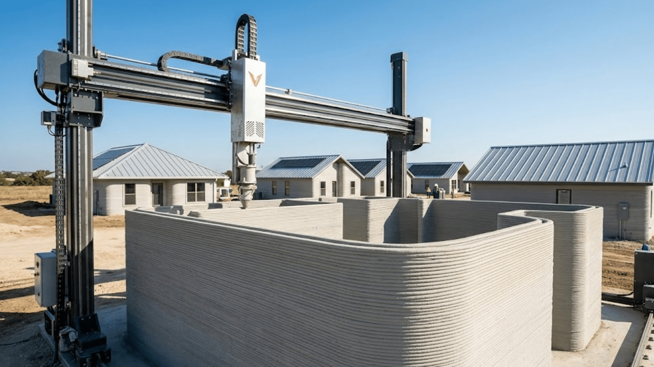 A impressora Vulcan opera depositando o Lavacrete camada por camada através de um bico extrusor, seguindo um projeto digital com precisão milimétrica. Esse processo cria paredes monolíticas com uma textura estriada característica, eliminando a necessidade de reforços extras ou das tradicionais fôrmas de madeira utilizadas na construção civil.