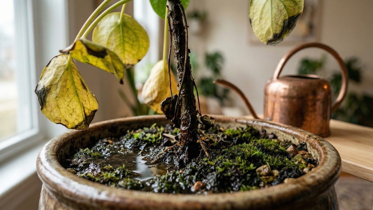 Alguns sinais ajudam a diferenciar a situação. Se a terra estiver sempre úmida, pesada e com cheiro desagradável, o problema pode estar no encharcamento. Folhas amareladas, caules amolecidos e aparência abatida mesmo após a rega também acendem esse alerta.