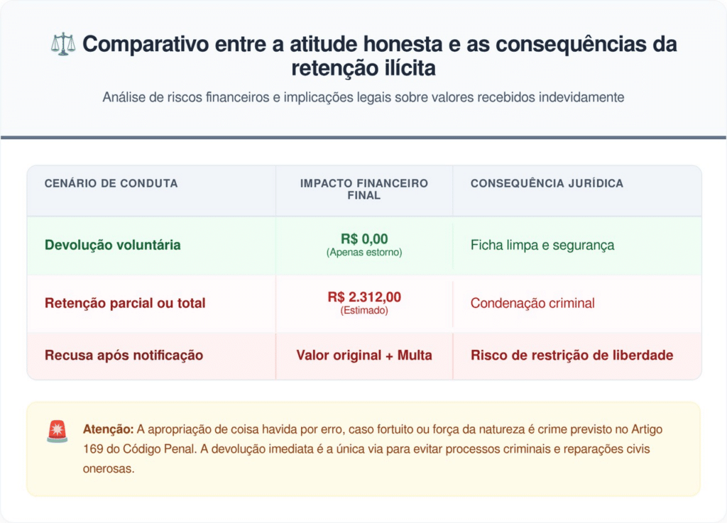 Diferente de uma disputa cível comum, a apropriação de algo recebido por erro é tipificada no Código Penal Brasileiro. A tentativa de obter vantagem indevida sobre um erro alheio é interpretada como má-fé, sujeitando o beneficiário a sanções que vão além da simples devolução do dinheiro.
