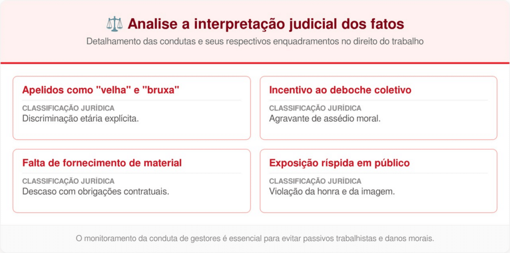 Para detalhar a fundamentação da sentença, apresentamos um comparativo sobre como as condutas da gerência foram classificadas pelos desembargadores. De acordo com a Wikipédia, o etarismo é uma das formas de preconceito que mais cresce nos ambientes corporativos modernos.