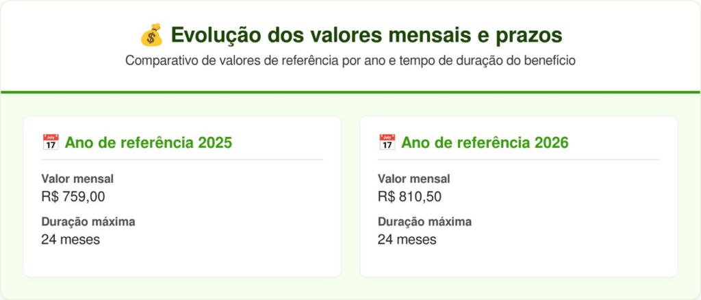 O benefício é calculado com base no salário mínimo nacional, garantindo R$ 759,00 mensais em 2025 e subindo para R$ 810,50 em 2026. O depósito é feito diretamente na conta do cuidador por um período de até 24 meses, podendo ser renovado ou interrompido conforme a situação do idoso.