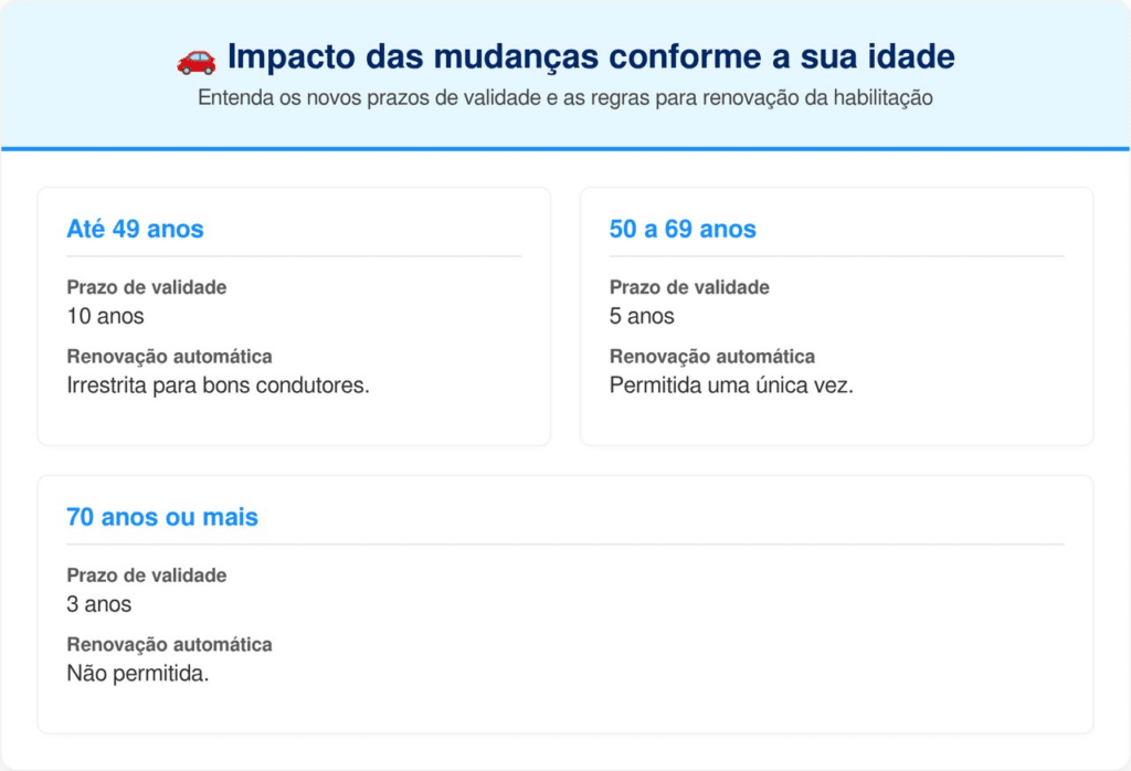 Na segunda renovação dentro dessa faixa etária, o exame médico presencial volta a ser obrigatório para garantir a segurança viária. Já os motoristas com 70 anos ou mais estão excluídos da renovação automática, devendo realizar todos os testes de aptidão física e mental presencialmente em cada ciclo.