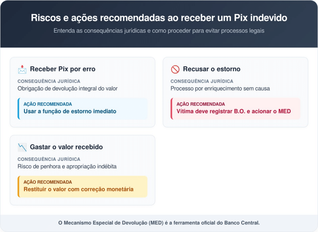 Diante desses riscos, entender as consequências jurídicas e as ações recomendadas ao receber um Pix indevido é essencial: