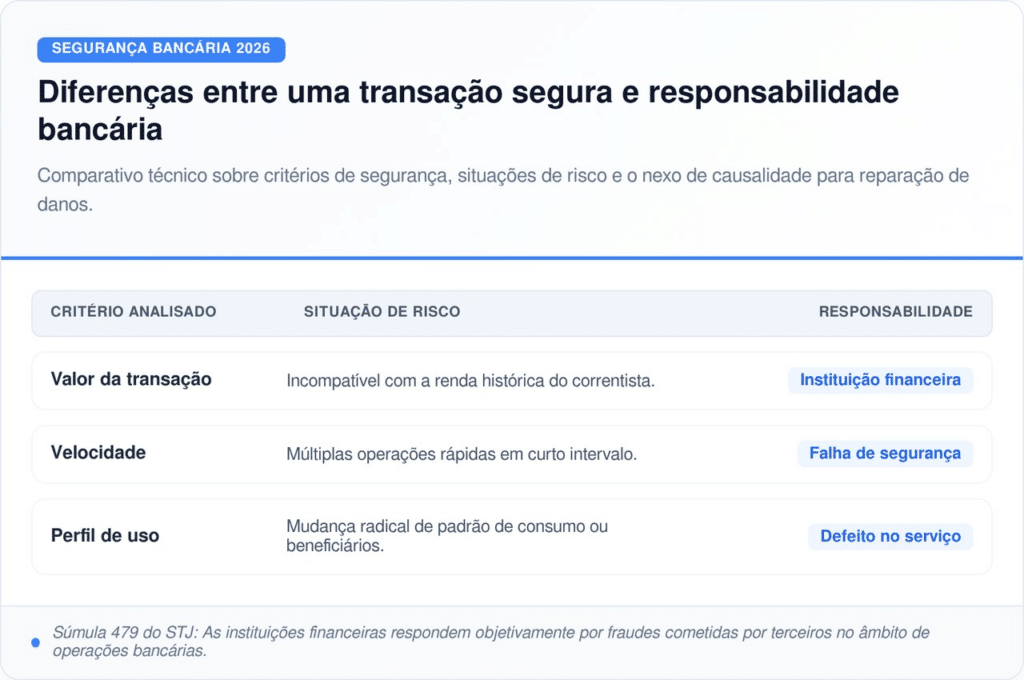 Para visualizar as diferenças entre uma transação segura e uma que gera responsabilidade bancária, acompanhe o comparativo técnico abaixo: