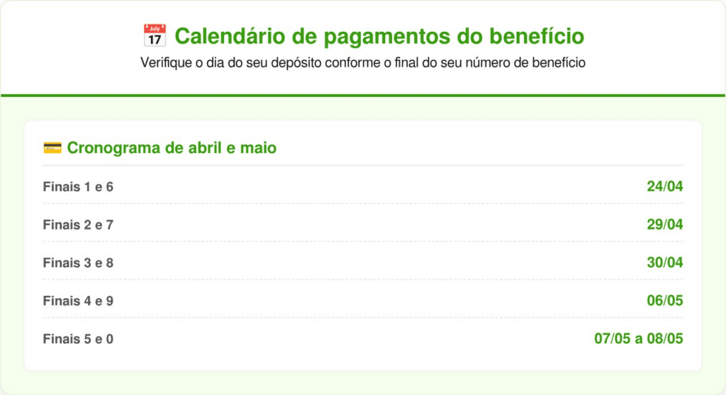 As datas são organizadas conforme o número final do cartão de benefício, desconsiderando o dígito verificador após o traço. O cronograma prioriza primeiro quem recebe até um salário mínimo e, na sequência, os segurados com rendimentos superiores ao piso nacional.