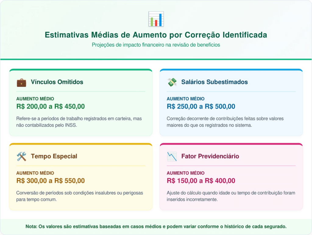 Analise as estimativas médias de aumento conforme o tipo de correção identificada: