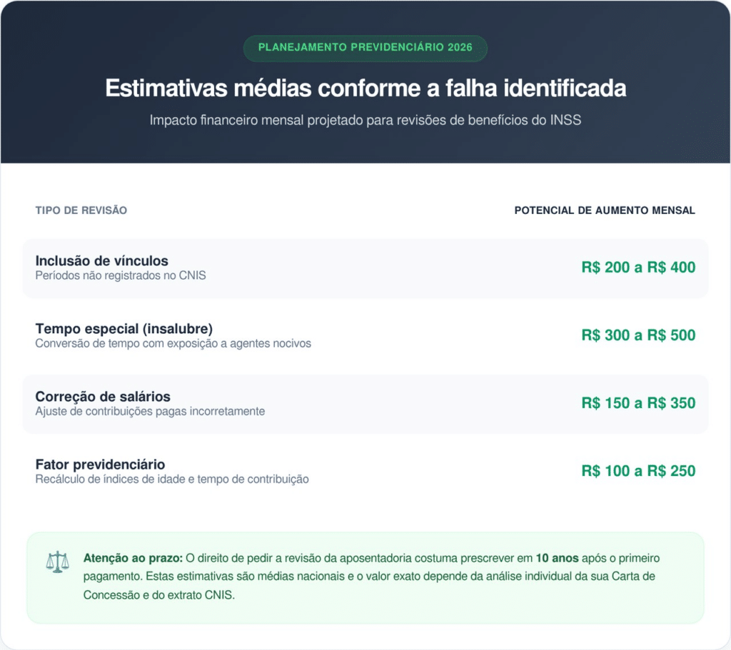 O potencial de ganho varia conforme a gravidade do erro identificado no processo administrativo original. Cada categoria de revisão possui um impacto distinto na Renda Mensal Inicial (RMI) do benefício concedido.