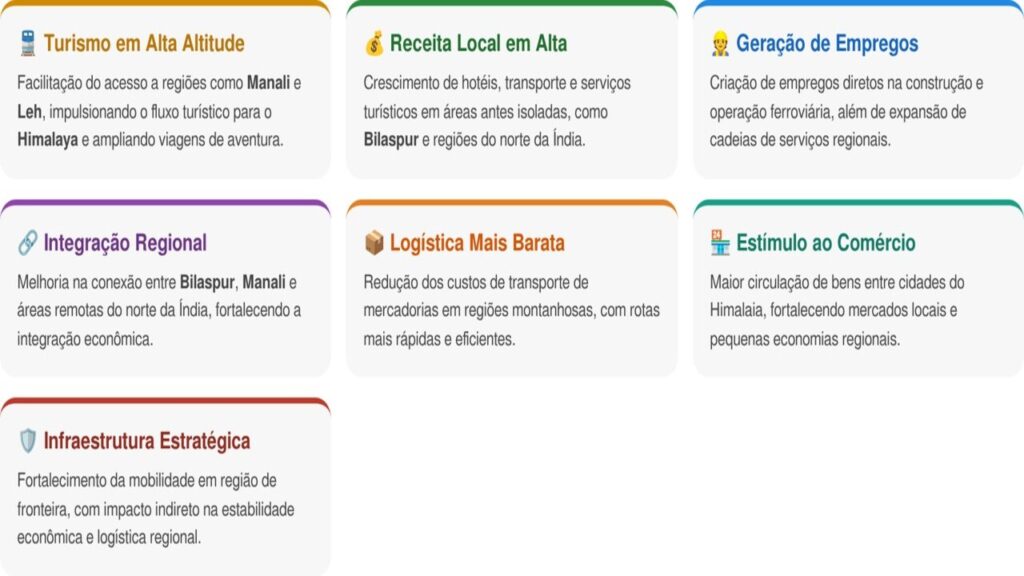 Além disso, o projeto promete integrar regiões isoladas do norte da Índia, melhorando o fluxo de pessoas, mercadorias e suprimentos. Isso pode transformar a dinâmica econômica de estados como Himachal Pradesh e Ladakh.